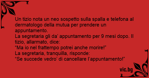 Un tizio nota un neo sospetto sulla spalla e telefona al dermatologo della mutua per prendere un appuntamento.