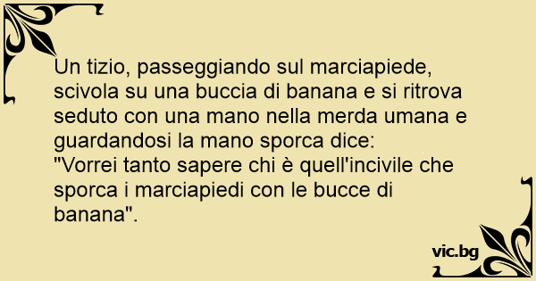 Un tizio, passeggiando sul marciapiede, scivola su una buccia di banana e si ritrova seduto соn una mano nella меrdа umana e guardandosi la mano sporca dice: