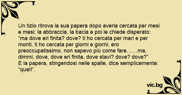 Un tizio ritrova la sua papera dopo averla cercata per mesi e mesi; la abbraccia, la bacia e poi le chiede disperato: