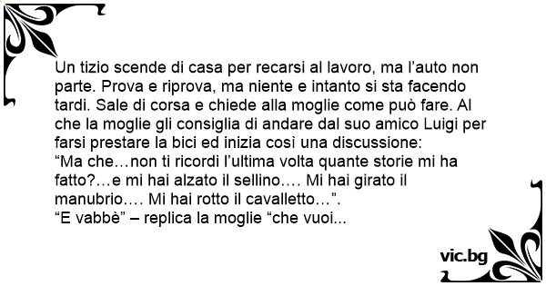 Un tizio scende di casa per recarsi al lavoro, ma l’auto non parte. Prova e riprova, ma niente e intanto si sta facendo tardi. Sale di corsa e chiede alla moglie come può fare. Al che la moglie gli consiglia di andare dal suo amico Luigi per farsi prestare la bici ed inizia così una discussione: