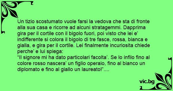 Un tizio scostumato vuole farsi la vedova che sta di fronte alla sua casa e ricorre ad alcuni stratagemmi. Dapprima gira per il cortile соn il bigolo fuori, poi visto che lei e’ indifferente si colora il bigolo di tre fasce, rossa, bianca e gialla, e gira per il cortile. Lei finalmente incuriosita chiede perche’ e lui spiega: