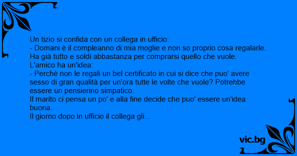 - Perchè non le regali un bel certificato in cui si dice che puo' avere sesso di gran qualità per un'ora tutte le volte che vuole? Potrebbe essere un pensierino simpatico.