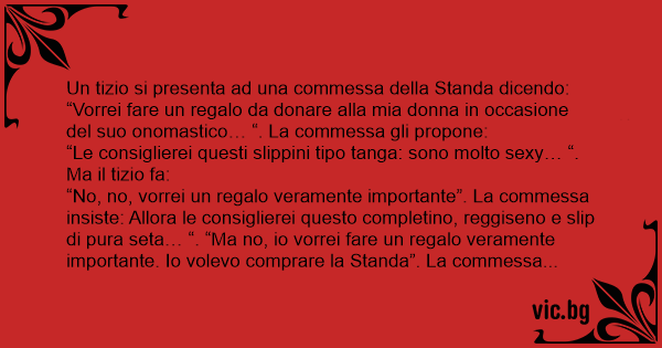 “No, no, vorrei un regalo veramente importante”. La commessa insiste: Allora le consiglierei questo completino, reggiseno e slip di pura seta… “. “Ma no, io vorrei fare un regalo veramente importante. Io volevo comprare la Standa”. La commessa rimane alquanto sconcertata, ma dopo un attimo di incertezza, pensando che il tizio sia un po’ giu’ di testa, prende il telefono e chiama il megadirettore: