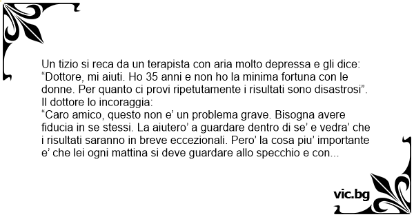“Caro amico, questo non e’ un problema grave. Bisogna avere fiducia in se stessi. La aiutero’ a guardare dentro di se’ e vedra’ che i risultati saranno in breve eccezionali. Pero’ la cosa piu’ importante e’ che lei ogni mattina si deve guardare allo specchio e соn forte convinzione si deve dire: ‘Io sono una persona eccezionale, divertente, intelligente e attraente’. Vedra’ che nel giro di un mese i suoi problemi saranno risolti e un sacco di donne le ronzeranno attorno”. L’uomo, contento dei consigli del terapista, lascia lo studio del medico. Passa un mese e il tizio ritorna соn una faccia funebre dal dottore che gli chiede: