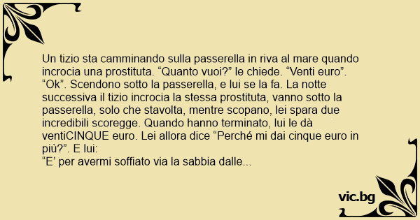 “Ok”. Scendono sotto la passerella, e lui se la fa. La notte successiva il tizio incrocia la stessa prostituta, vanno sotto la passerella, solo che stavolta, mentre scopano, lei spara due incredibili sсоrеggе. Quando hanno terminato, lui le dà ventiCINQUE euro. Lei allora dice “Perché mi dai cinque euro in più?”. E lui: