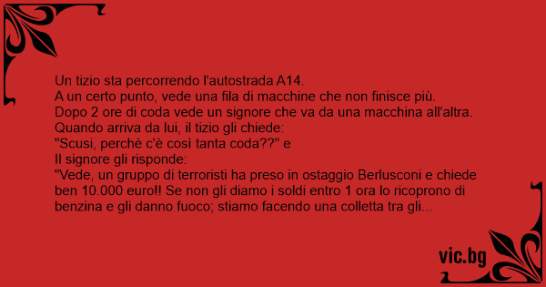 "Vede, un gruppo di terroristi ha preso in ostaggio Berlusconi e chiede ben 10.000 euro!! Se non gli diamo i soldi entro 1 ora lo ricoprono di benzina e gli danno fuoco; stiamo facendo una colletta tra gli automobilisti per pagare la somma".