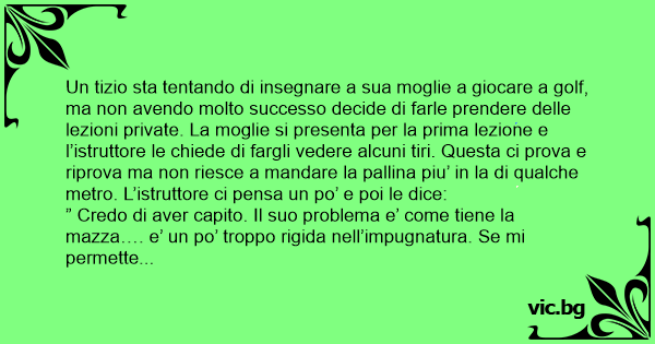 Un tizio sta tentando di insegnare a sua moglie a giocare a golf, ma non avendo molto successo decide di farle prendere delle lezioni private. La moglie si presenta per la prima lezione e l’istruttore le chiede di fargli vedere alcuni tiri. Questa ci prova e riprova ma non riesce a mandare la pallina piu’ in la di qualche metro. L’istruttore ci pensa un po’ e poi le dice: