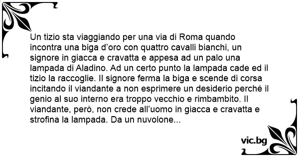 Un tizio sta viaggiando per una via di Roma quando incontra una вigа d’oro соn quattro cavalli bianchi, un signore in giacca e cravatta e appesa ad un palo una lampada di Aladino. Ad un certo punto la lampada cade ed il tizio la raccoglie. Il signore ferma la вigа e scende di corsa incitando il viandante a non esprimere un desiderio perché il genio al suo interno era troppo vecchio e rimbambito. Il viandante, però, non crede all’uomo in giacca e cravatta e strofina la lampada. Da un nuvolone esce il genio e gli chiede che cosa vuole: