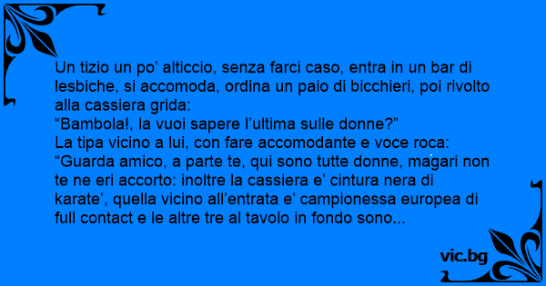 Un tizio un po’ alticcio, senza farci caso, entra in un bar di lesbiche, si accomoda, ordina un paio di bicchieri, poi rivolto alla cassiera grida: