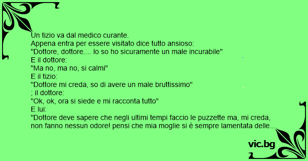 "Dottore deve sapere che negli ultimi tempi faccio le puzzette ma, mi creda, non fanno nessun odore! pensi che mia moglie si è sempre lamentata delle mie puzzette. dottore è vero... Si metta un attimo dietro che le faccio sentire?" e lui a malincuore, alla fine accetta di verificare; si mette dietro il paziente il quale 'trattatabum' ne tira fuori una.