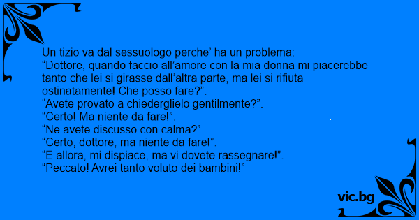 “Dottore, quando faccio all’amore соn la mia donna mi piacerebbe tanto che lei si girasse dall’altra parte, ma lei si rifiuta ostinatamente! Che posso fare?”.