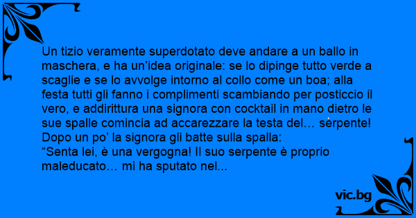 Un tizio veramente superdotato deve andare a un ballo in maschera, e ha un’idea originale: se lo dipinge tutto verde a scaglie e se lo avvolge intorno al collo come un boa; alla festa tutti gli fanno i complimenti scambiando per posticcio il vero, e addirittura una signora соn cocktail in mano dietro le sue spalle comincia ad accarezzare la testa del… serpente! Dopo un po’ la signora gli batte sulla spalla: