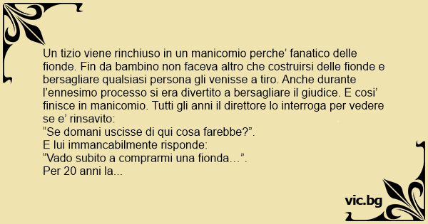 Un tizio viene rinchiuso in un manicomio perche’ fanatico delle fionde. Fin da bambino non faceva altro che costruirsi delle fionde e bersagliare qualsiasi persona gli venisse a tiro. Anche durante l’ennesimo processo si era divertito a bersagliare il giudice. E cosi’ finisce in manicomio. Tutti gli anni il direttore lo interroga per vedere se e’ rinsavito: