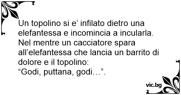 Un topolino si e’ infilato dietro una elefantessa e incomincia a incularla. Nel mentre un cacciatore spara all’elefantessa che lancia un barrito di dolore e il topolino: