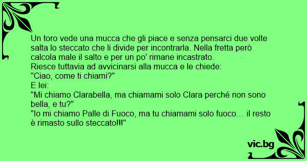 Este era una vaca y un torito que se querían profundamente pero, Vivian en granjas distintas y los separaba un alambre de puas, entonces un día el torito se armo de valor y salto y cuando ve a su amada le pregunta: - Linda vaquita ¿Cómo te llamas? La vaquita contesta- ROSA CORAZON, pero me...