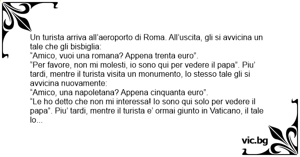 “Le hо detto che non mi interessa! Io sono qui solo per vedere il papa”. Piu’ tardi, mentre il turista e’ ormai giunto in Vaticano, il tale lo riavvicina e gli bisbiglia all’orecchio: