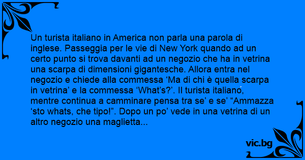 Un turista italiano in America non parla una parola di inglese. Passeggia per le vie di New York quando ad un certo punto si trova davanti ad un negozio che ha in vetrina una scarpa di dimensioni gigantesche. Allora entra nel negozio e chiede alla commessa ‘Ma di chi è quella scarpa in vetrina’ e la commessa ‘What’s?’. Il turista italiano, mentre continua a camminare pensa tra se’ e se’ “Ammazza ‘sto whats, che tipo!”. Dopo un po’ vede in una vetrina di un altro negozio una maglietta gigantesca, entra dentro, e fa la stessa domanda alla commessa ottenendo la stessa risposta. Sempre più incuriosito, continua a camminare e vede in un altro negozio ancora un paio di pantaloni enormi. Stessa scena, stessa risposta. Il tizio, sempre più convinto che doveva conoscere questo whats, continua a passeggiare quando incontra un corteo funebre che trasporta una piccola bara, forse quella di un bambino. Si avvicina ad una tizia del corteo e le chiede ‘chi è morto?’ e quella ‘What’s?’. E il tizio: ‘Si vabbè…. Lì c’entra il саzzо di whats!’ .