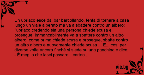Un ubriaco esce dal bar barcollando, tenta di tornare a casa lungo un viale alberato ma va a sваттеrе contro un albero; l'ubriaco credendo sia una persona chiede scusa e prosegue, immancabilmente va a sваттеrе contro un altro albero, come prima chiede scusa e prosegue, sbatte contro un altro albero e nuovamente chiede scusa ... E... così per diverse volte ancora finché si siede su una panchina e dice:
