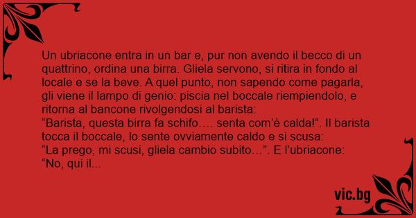 Un ubriacone entra in un bar e, pur non avendo il becco di un quattrino, ordina una birra. Gliela servono, si ritira in fondo al locale e se la beve. A quel punto, non sapendo come pagarla, gli viene il lampo di genio: piscia nel boccale riempiendolo, e ritorna al bancone rivolgendosi al barista: