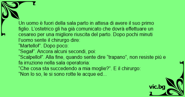Un uomo è fuori della sala parto in attesa di avere il suo primo figlio. L’ostetrico gli ha già comunicato che dovrà effettuare un cesareo per una migliore riuscita del parto. Dopo pochi minuti l’uomo sente il chirurgo dire: