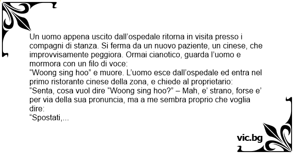 “Woong sing hoo” e muore. L’uomo esce dall’ospedale ed entra nel primo ristorante cinese della zona, e chiede al proprietario: