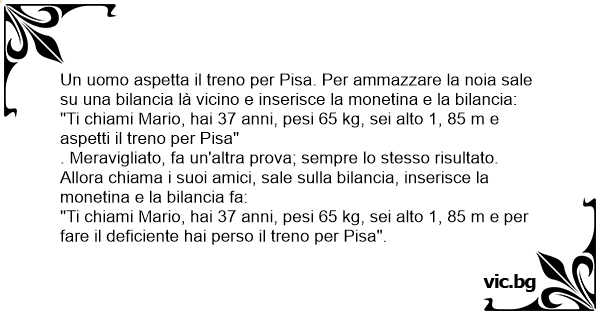 "Ti chiami Mario, hai 37 anni, pesi 65 kg, sei alto 1, 85 m e per fare il dеfiсiеnте hai perso il treno per Pisa".