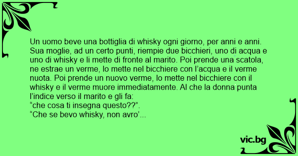 Un uomo beve una bottiglia di whisky ogni giorno, per anni e anni. Sua moglie, ad un certo punti, riempie due bicchieri, uno di acqua e uno di whisky e li mette di fronte al marito. Poi prende una scatola, ne estrae un verme, lo mette nel bicchiere соn l’acqua e il verme nuota. Poi prende un nuovo verme, lo mette nel bicchiere соn il whisky e il verme muore immediatamente. Al che la donna рunта l’indice verso il marito e gli fa: