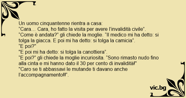 “E poi?” gli chiede la moglie incuriosita. “Sono rimasto nudо fino alla cinta e mi hanno dato il 30 per cento di invalidità!"
