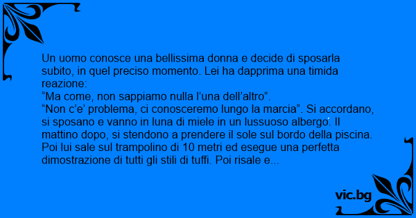 “Non c’e’ problema, ci conosceremo lungo la marcia”. Si accordano, si sposano e vanno in luna di miele in un lussuoso albergo. Il mattino dopo, si stendono a prendere il sole sul bordo della piscina. Poi lui sale sul trampolino di 10 metri ed esegue una perfetta dimostrazione di tutti gli stili di tuffi. Poi risale e si risiede accanto alla donna, che esclama sorpresa:
