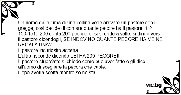 Un uomo dalla cima di una collina vede arrivare un pastore соn il gregge, cosi decide di contare quante pecore ha il pastore: 1-2-.... 150-151.. 200 conta 200 pecore, cosi scende a valle, si dirige verso il pastore dicendogli, SE INDOVINO QUANTE PECORE HA ME NE REGALA UNA?