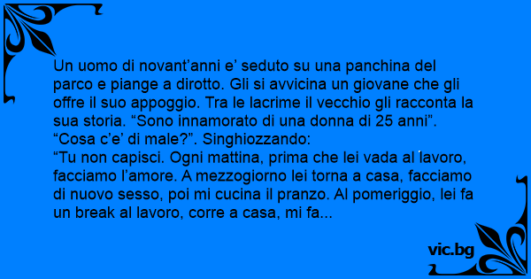 Un uomo di novant’anni e’ seduto su una panchina del parco e piange a dirotto. Gli si avvicina un giovane che gli offre il suo appoggio. Tra le lacrime il vecchio gli racconta la sua storia. “Sono innamorato di una donna di 25 anni”.