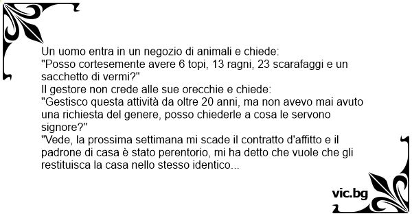 У зоомагазині: — Дайте мені 276 клопів, 52 тарганів, 18 мишей і 5 щурів. — Навіщо? — Мене виселяють і вимагають, що б я залишив будинок в тому стані, в якому він був.