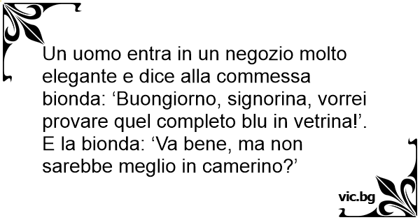Un uomo entra in un negozio molto elegante e dice alla commessa bionda: ‘Buongiorno, signorina, vorrei provare quel completo blu in vetrina!’. E la bionda: ‘Va bene, ma non sarebbe meglio in camerino?’