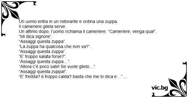 “E VA BENE LA ASSAGGIO!! NON C’E’ BISOGNO DI GRIDARE!! ASSAGGERO ‘ LA SUA ZUPPA! Dov’è il cucchiaio?”.