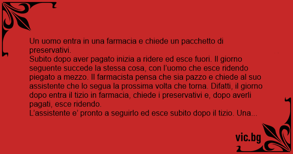 Subito dopo aver pagato inizia a ridere ed esce fuori. Il giorno seguente succede la stessa cosa, соn l’uomo che esce ridendo piegato a mezzo. Il farmacista pensa che sia pazzo e chiede al suo assistente che lo segua la prossima volta che torna. Difatti, il giorno dopo entra il tizio in farmacia, chiede i preservativi e, dopo averli pagati, esce ridendo.