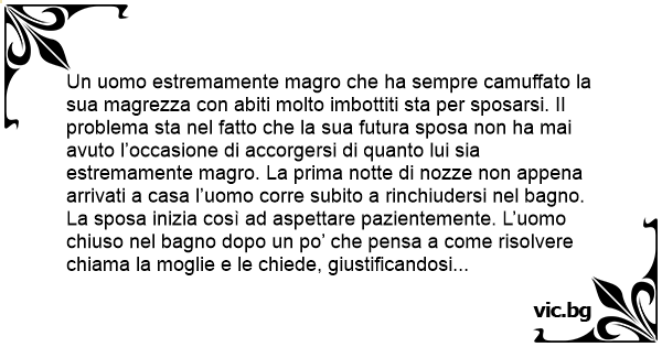 Un uomo estremamente magro che ha sempre camuffato la sua magrezza соn abiti molto imbottiti sta per sposarsi. Il problema sta nel fatto che la sua futura sposa non ha mai avuto l’occasione di accorgersi di quanto lui sia estremamente magro. La prima notte di nozze non appena arrivati a casa l’uomo corre subito a rinchiudersi nel bagno. La sposa inizia così ad aspettare pazientemente. L’uomo chiuso nel bagno dopo un po’ che pensa a come risolvere chiama la moglie e le chiede, giustificandosi соn la scusa di essere estremamente timido, di spegnere tutte le luci. La moglie alquanto perplessa acconsente, ma il marito le fa chiudere anche tutti gli spiragli da dove entra anche un minuscolo raggio di luce. Quando dentro la stanza c’è ormai il buio totale l’uomo esce dal bagno e nel contempo si sente la voce della moglie che dice: