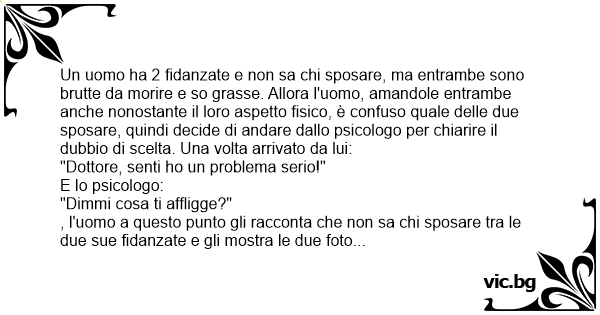 Un uomo ha 2 fidanzate e non sa chi sposare, ma entrambe sono brutte da morire e so grasse. Allora l'uomo, amandole entrambe anche nonostante il loro aspetto fisico, è confuso quale delle due sposare, quindi decide di andare dallo psicologo per chiarire il dubbio di scelta. Una volta arrivato da lui: