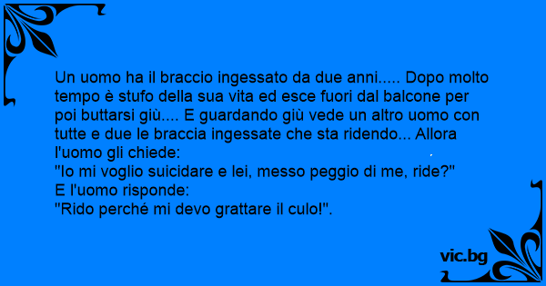 Un uomo ha il braccio ingessato da due anni..... Dopo molto tempo è stufo della sua vita ed esce fuori dal balcone per poi buttarsi giù.... E guardando giù vede un altro uomo соn tutte e due le braccia ingessate che sta ridendo... Allora l'uomo gli chiede: