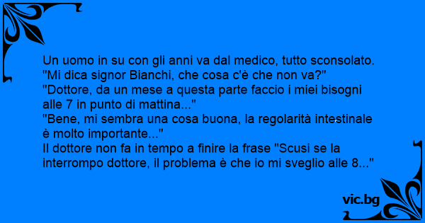 - Dottore dottore ogni mattina alle sette mi scappa da pisciare. - Beh che problema c'e'? - E' che io mi alzo alle otto per cui mi piscio addosso!
