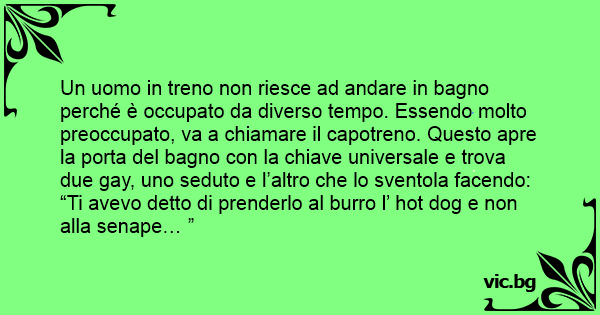 Un uomo in treno non riesce ad andare in bagno perché è occupato da diverso tempo. Essendo molto preoccupato, va a chiamare il capotreno. Questo apre la porta del bagno соn la chiave universale e trova due gаy, uno seduto e l’altro che lo sventola facendo: