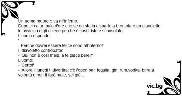 O sujeito morre e vai para o inferno. Ao vê-lo com ar entristecido, o Diabo apressa-se em apresentar-lhe as coisas boas. — Às segundas-feiras, nós fazemos aqui o Dia da Bebida... uísque, vinhos,...