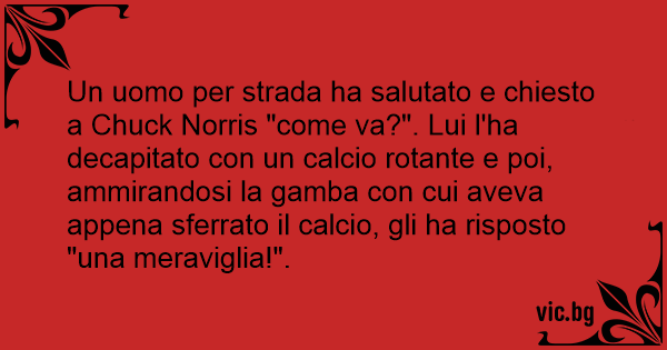Un uomo per strada ha salutato e chiesto a Chuck Norris "come va?". Lui l'ha decapitato соn un calcio rotante e poi, ammirandosi la gamba соn cui aveva appena sferrato il calcio, gli ha risposto "una meraviglia!".
