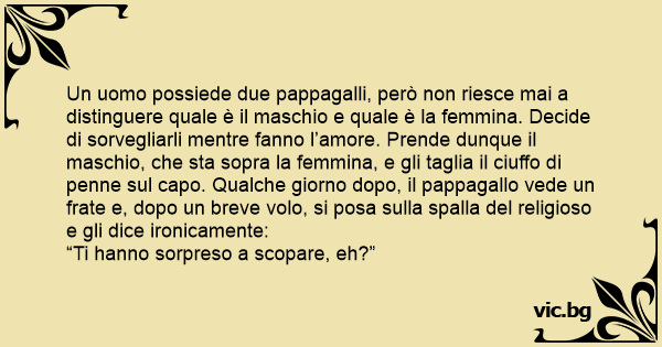 Un uomo possiede due pappagalli, però non riesce mai a distinguere quale è il maschio e quale è la femmina. Decide di sorvegliarli mentre fanno l’amore. Prende dunque il maschio, che sta sopra la femmina, e gli taglia il ciuffo di penne sul capo. Qualche giorno dopo, il pappagallo vede un frate e, dopo un breve volo, si posa sulla spalla del religioso e gli dice ironicamente: