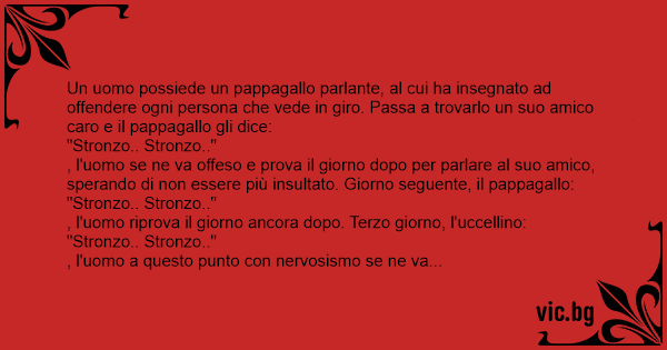 Un uomo possiede un pappagallo parlante, al cui ha insegnato ad offendere ogni persona che vede in giro. Passa a trovarlo un suo amico caro e il pappagallo gli dice: