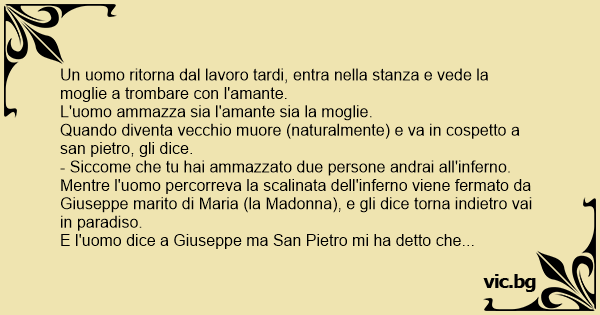 E l'uomo dice a Giuseppe ma San Pietro mi ha detto che dovevo andare all'inferno, Giuseppe rispose che siccome che era l'uomo che ha cresciuto Gesù aveva poteri superiori a San Pietro e lo autorizzava di andare in paradiso.