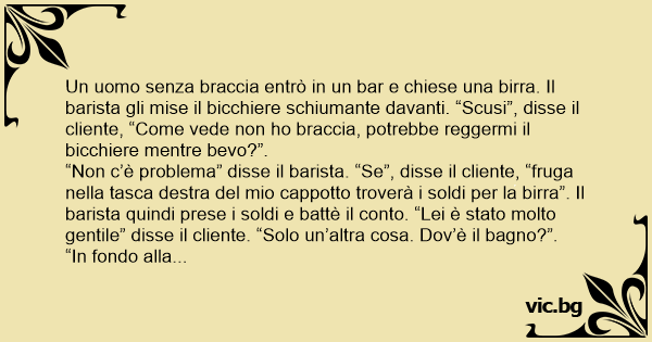 Un uomo senza braccia entrò in un bar e chiese una birra. Il barista gli mise il bicchiere schiumante davanti. “Scusi”, disse il cliente, “Come vede non hо braccia, potrebbe reggermi il bicchiere mentre bevo?”.