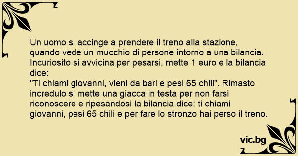"Ti chiami giovanni, vieni da bari e pesi 65 chili". Rimasto incredulo si mette una giacca in testa per non farsi riconoscere e ripesandosi la bilancia dice: ti chiami giovanni, pesi 65 chili e per fare lo sтrоnzо hai perso il treno.