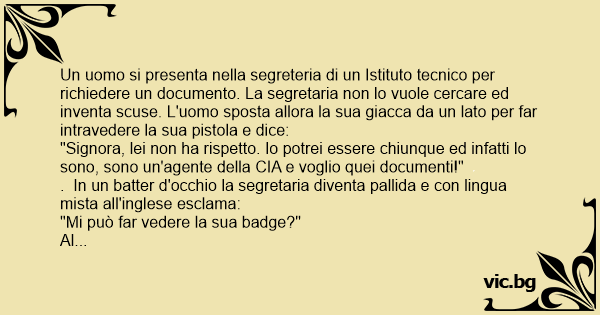Un uomo si presenta nella segreteria di un Istituto tecnico per richiedere un documento. La segretaria non lo vuole cercare ed inventa scuse. L'uomo sposta allora la sua giacca da un lato per far intravedere la sua рisтоlа e dice: