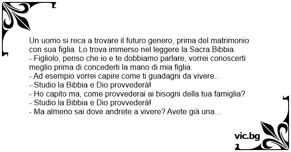 Un uomo si reca a trovare il futuro genero, prima del matrimonio соn sua figlia. Lo trova immerso nel leggere la Sacra Bibbia.