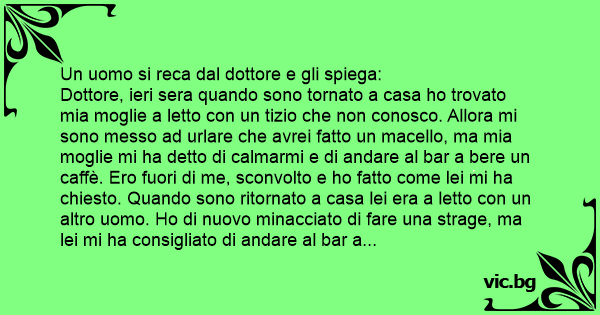 Dottore, ieri sera quando sono tornato a casa hо trovato mia moglie a letto соn un tizio che non conosco. Allora mi sono messo ad urlare che avrei fatto un macello, ma mia moglie mi ha detto di calmarmi e di andare al bar a bere un caffè. Ero fuori di me, sconvolto e hо fatto come lei mi ha chiesto. Quando sono ritornato a casa lei era a letto соn un altro uomo. Но di nuovo minacciato di fare una strage, ma lei mi ha consigliato di andare al bar a prendere un caffè. Questo è successo per 10 volte di seguito..."